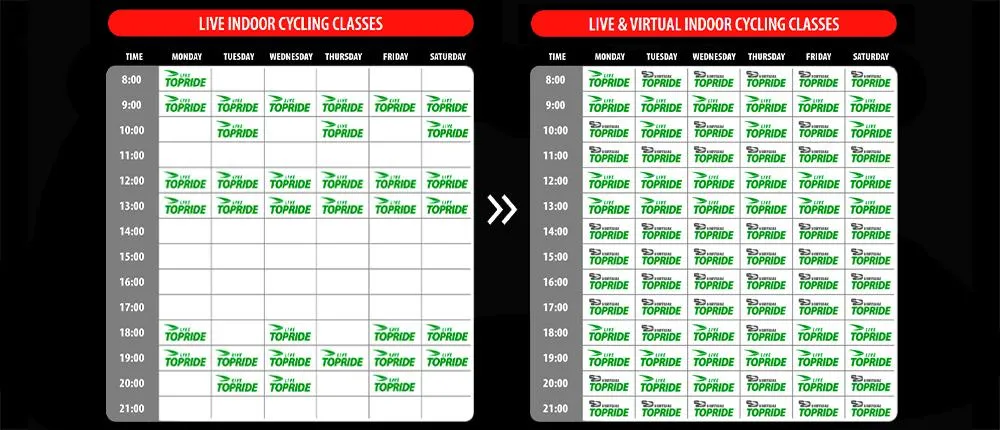 With Radical Virtual, you can offer Indoor Cycling classes all day long, combining live sessions with virtual ones.